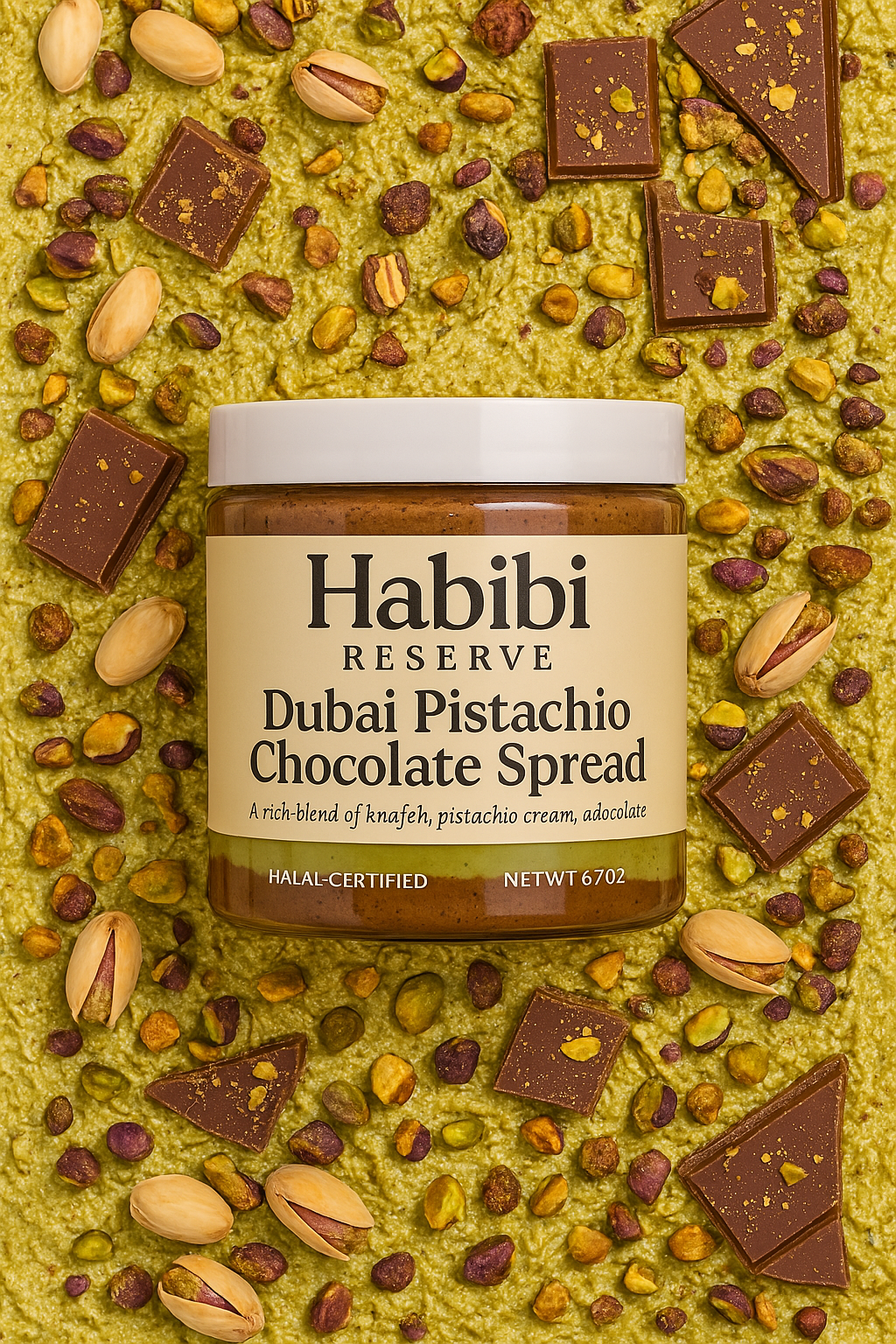 "I can’t stop eating this. From the very first spoonful, Habibi Reserve's Original Dubai Chocolate Spread had me hooked. It's rich, velvety, and indulgent — like dipping into a jar of luxury. The flavor? A decadent dance between silky chocolate, creamy hazelnut, and a whisper of roasted pistachio, kissed with just enough sweetness to make your eyes close with pleasure."